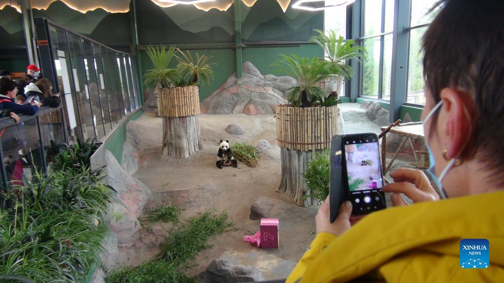 Visitors take photos of giant panda Jin Baobao at Ahtari zoo in Ahtari, Finland, Sept. 18, 2021. Sept. 18 marks Jin Baobao's birthday. In January 2018, two pandas, Hua Bao and Jin Baobao, arrived in Finland, the first Nordic country to receive a pair of giant pandas from China. Finns gave them the Finnish nicknames "Pyry" and "Lumi," which mean "heavy snowfall" and "snow." (Xinhua/Chen Jing)