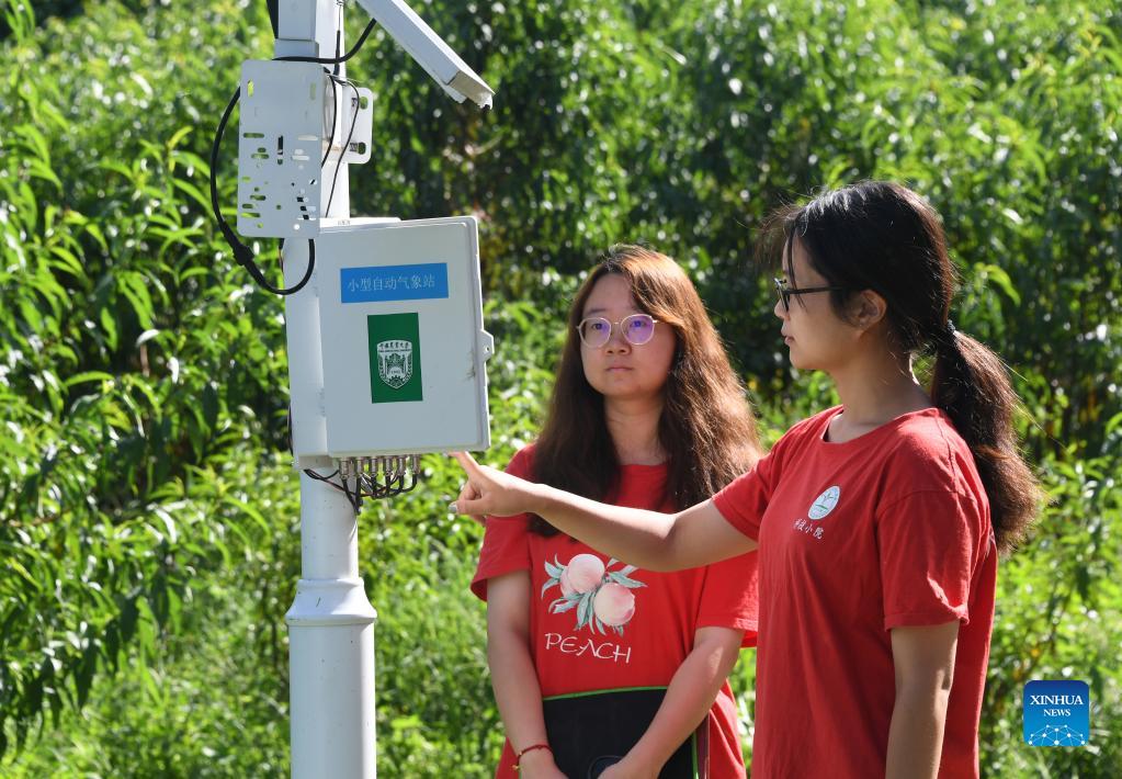 Bai Jie (R) and Li Ziyue, college students from China Agricultural University, check a small weather station in Future Orchard in Xiying Village of Yukou Township in Pinggu District of Beijing, capital of China, Aug. 25, 2021. "Future Orchard" is a high-tech orchard founded by local government with China Agricultural University and other enterprises. The orchard has a lab and four hectares of land with peach and kiwi trees. With the help of intelligent monitoring system for data analysis, accurate management and visual diagnosis on the environment of fruit trees, the orchard realizes improvement of planting efficiency, fruit yield and quality. (Xinhua/Ren Chao)