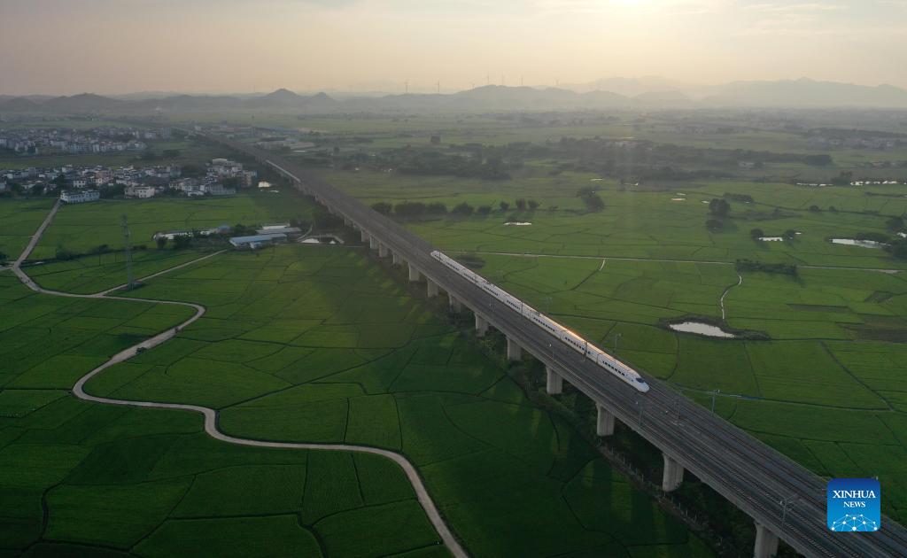 Aerial photo taken on Sept. 19, 2021 shows a bullet train running above paddy fields in Gula Township, Binyang County, south China's Guangxi Zhuang Autonomous Region. (Xinhua/Huang Xiaobang)