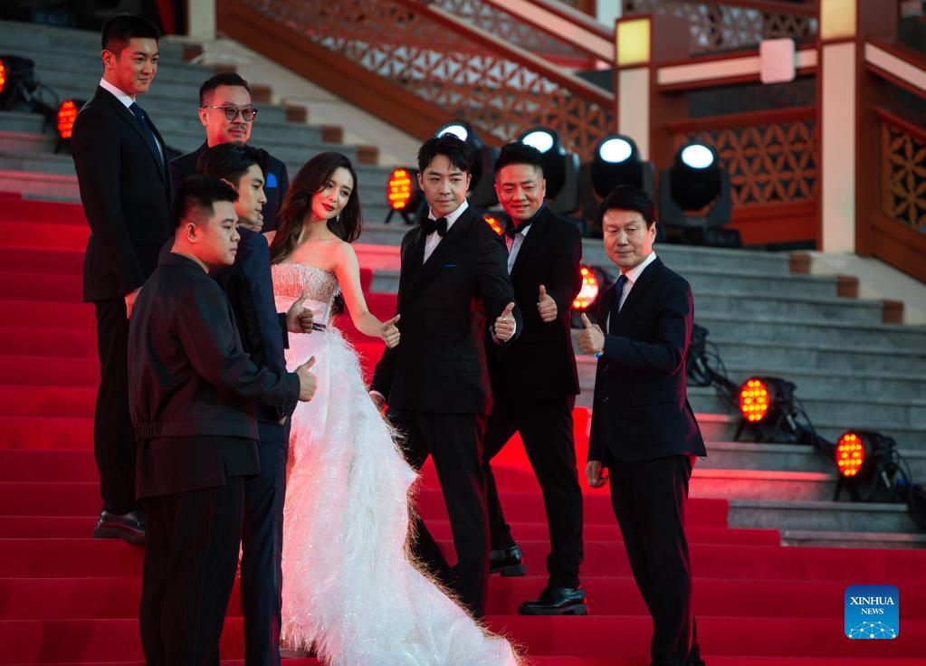 Cast members of the film Flashover pose for a group photo on the red carpet for the 11th Beijing International Film Festival in Beijing, capital of China, Sept. 20, 2021. (Xinhua/Chen Zhonghao)