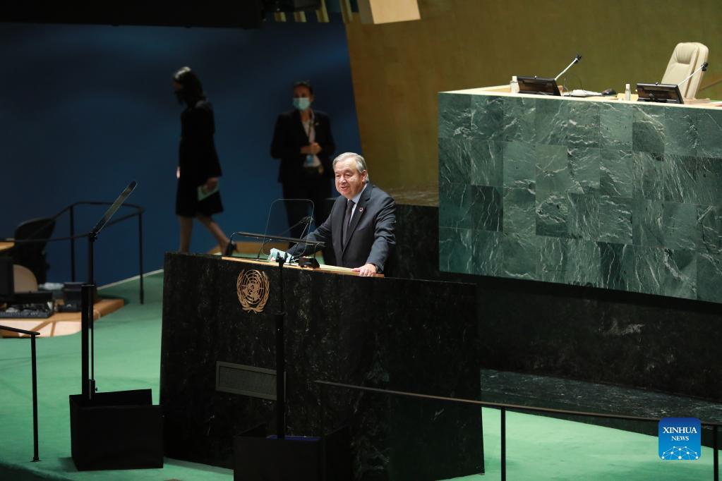 United Nations Secretary-General Antonio Guterres (front) speaks at the second SDG Moment, a high-level event to galvanize global action toward the 2030 Agenda in the General Assembly Hall at the UN headquarters in New York, on Sept. 20, 2021. Guterres on Monday called for more effort to bring the Sustainable Development Goals (SDGs) back on track. (Xinhua/Xie E)