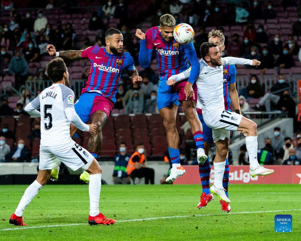 Barcelona's Ronald Araujo (R) scores a goal during a Spanish first division league football match between FC Barcelona and Granada CF in Barcelona, Spain, on Sept. 20, 2021. (Photo by Joan Gosa/Xinhua)