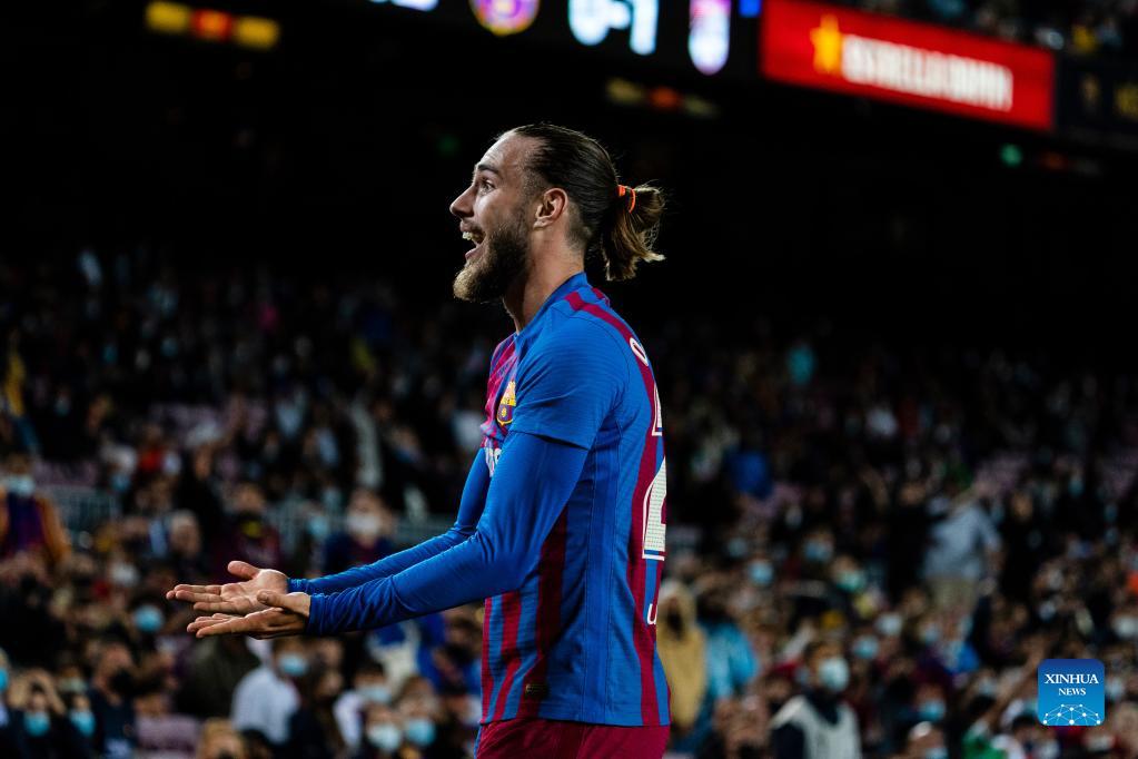 Barcelona's Oscar Mingueza reacts during a Spanish first division league football match between FC Barcelona and Granada CF in Barcelona, Spain, on Sept. 20, 2021. (Photo by Joan Gosa/Xinhua)