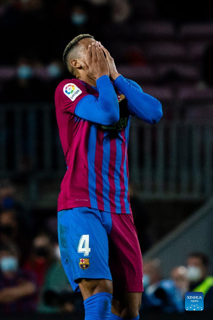 Barcelona's Ronald Araujo reacts during a Spanish first division league football match between FC Barcelona and Granada CF in Barcelona, Spain, on Sept. 20, 2021. (Photo by Joan Gosa/Xinhua)