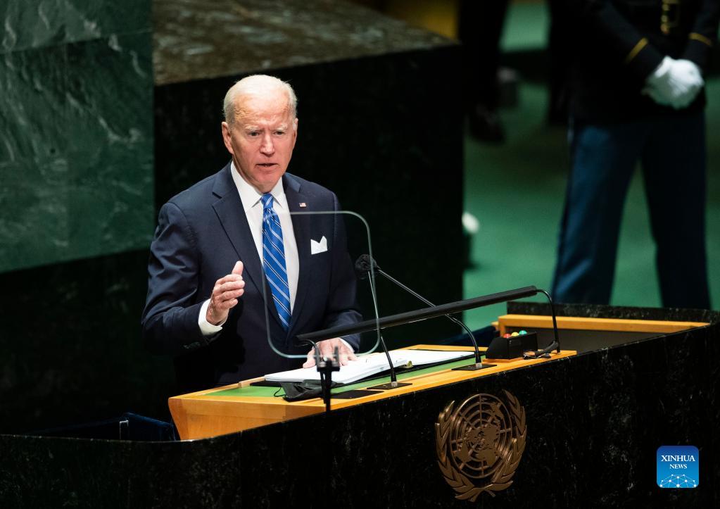 U.S. President Joe Biden speaks during the General Debate of the 76th session of the United Nations General Assembly at the UN headquarters in New York, on Sept. 21, 2021. Biden said in a speech at the United Nations on Tuesday that the United States is opening a new chapter of diplomacy after ending the two-decade Afghan war. (Xinhua/Wang Ying)