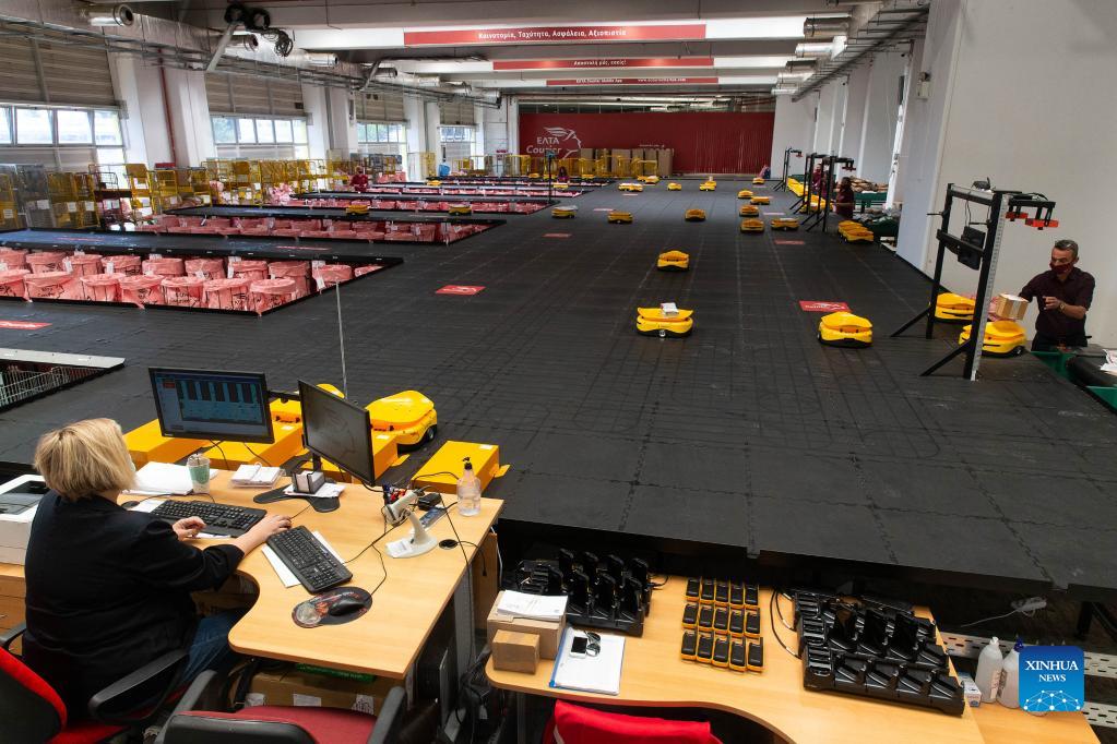 Chinese-made robots operate at the facilities of Greece's national postal services provider Hellenic Post (ELTA in Greek), at Kryoneri, a northern suburb of Athens, Greece, Sept. 14, 2021. The ELTA in Greek has started using a Chinese-made robotic system for sorting mail items, aiming to accelerate the process and improve service for customers. The fully digitalized automated system is developed by China's Zhejiang LiBiao Robot Co., Ltd. Since mid-August, a fleet of 55 tiny yellow robots has joined employees at the Group's facilities in Kryoneri (Xinhua/Marios Lolos)