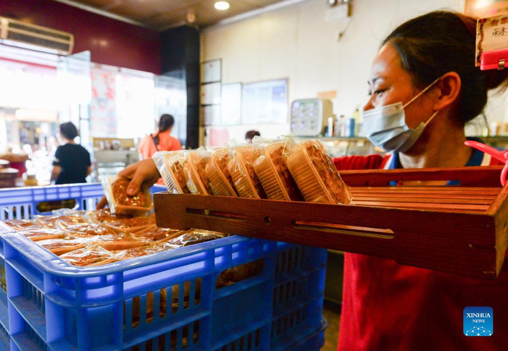 A staff member puts mooncakes in order at a Hainan-style mooncake shop in Haikou, capital of south China's Hainan Province, Sept. 19, 2021. Hainan-style mooncake combines the features of crispness and syrup golden crust. It's crispy in crust, rich in taste, sweet but not greasy. (Xinhua/Zhou Jiayi)