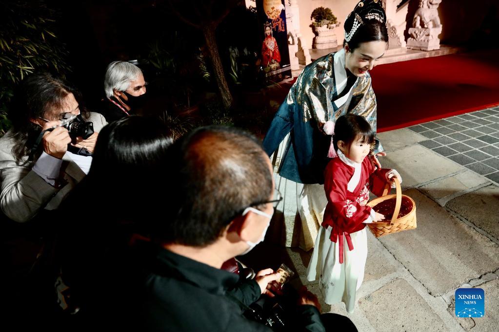 People dressed in traditional Chinese apparel perform during a special event to celebrate Mid-Autumn Festival at the USC Asian Pacific Museum in Pasadena, Los Angeles County, California, the United States, on Sept. 20, 2021. Celebrating the traditional Mid-Autumn Festival, the Sino US Performing Arts Organization held the special event featuring a fashion show and performance event inspired by Hanfu, traditional Chinese apparel, and thousands of years of evolving Chinese fashion. (Xinhua)