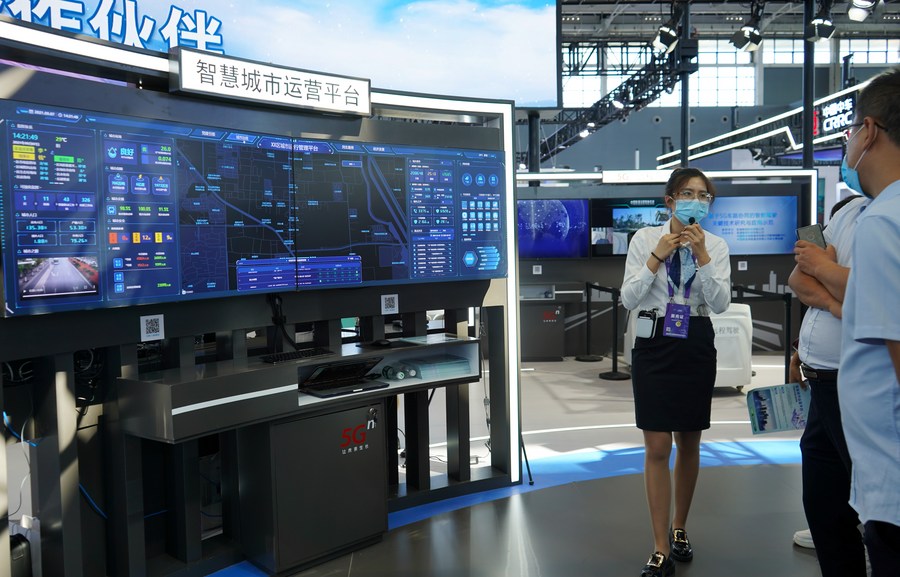 A staff member introduces a smart platform for city operation at the China International Digital Economy Expo 2021 in Shijiazhuang, north China's Hebei Province, Sept. 7, 2021. (Xinhua/Jin Haoyuan)