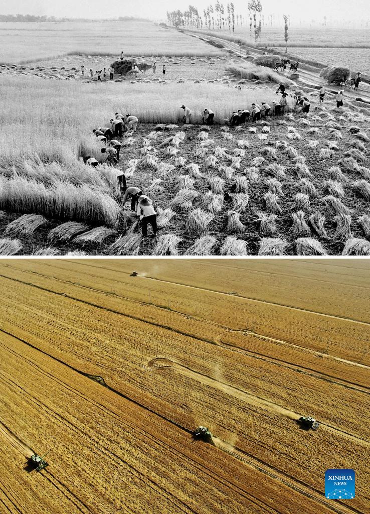 Combo photo shows farmers harvesting wheat with sickles in Yanshi County in the 1950s (top, photo taken by Tang Maolin), and reapers harvesting wheat in Zhoukou City on June 6, 2021 (aerial photo taken by Li An), in central China's Henan Province. Henan is an important province for agricultural production in China. Since the founding of the People's Republic of China in 1949, especially during the 40-plus years of reform and opening-up, mechanized and hi-tech farming has helped improve the quality and efficiency of agricultural business there. To date, an increasing number of farmers there are embracing advanced agricultural equipment and management process, bidding farewell to traditional arduous means of agricultural operation. (Xinhua)