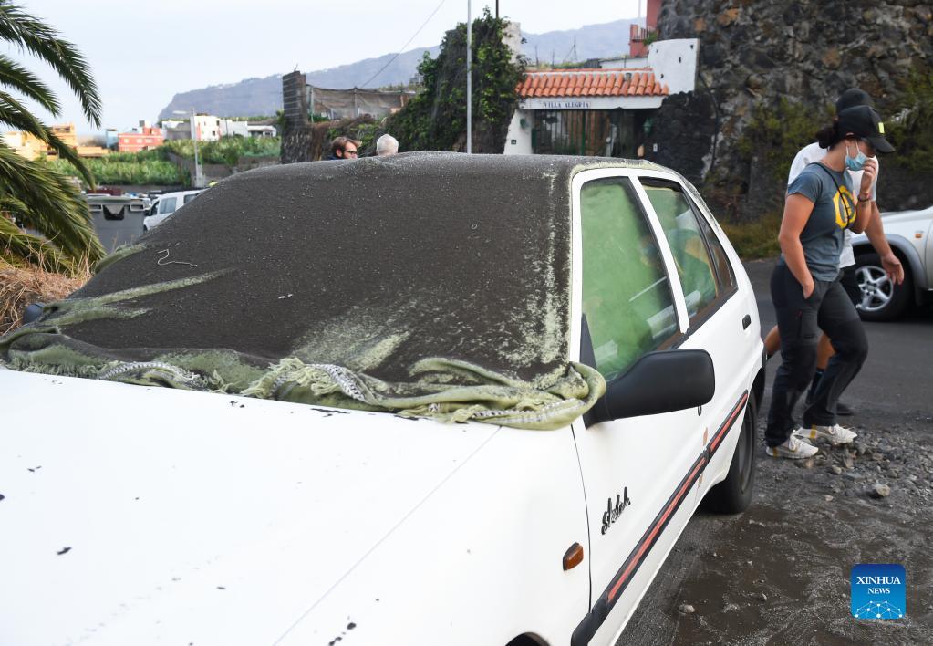 People walk past a vehicle covered by volcanic ash on the island of La Palma in the Canary Islands, Spain, on Sept. 22, 2021. The eruption of the Cumbre Vieja volcano is expected to last between 24 and 84 days, the Volcanology Institute of the Canary Islands (INVOLCAN) said on Wednesday. (Photo by Gustavo Valiente/Xinhua)