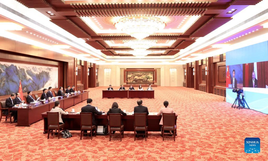 Li Zhanshu, chairman of the National People's Congress (NPC) Standing Committee, holds talks with Luxembourg's President of the Chamber of Deputies Fernand Etgen via video link at the Great Hall of the People in Beijing, capital of China, Sept. 22, 2021. (Xinhua/Pang Xinglei)