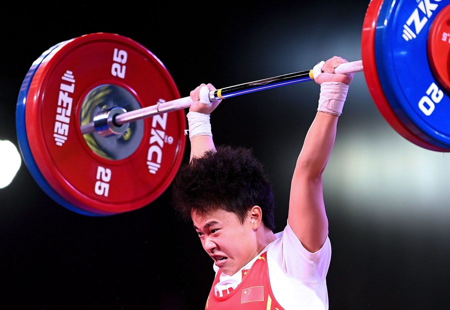 Hou Zhihui of Hunan in action in the women's 49kg weightlifting competition at China's 14th National Games, Sept. 16, 2021. (Xinhua/Bei He)