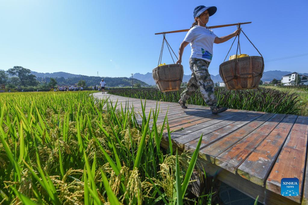A farmer participates in a rice-carrying relay game in Datong Township of Jiande, east China's Zhejiang Province, Sept. 22, 2021. A sports event themed on paddy field was held in Datong on Wednesday. The games included rice harvesting, wheelbarrow race, rice-carrying relay and tug of war. (Xinhua/Xu Yu)