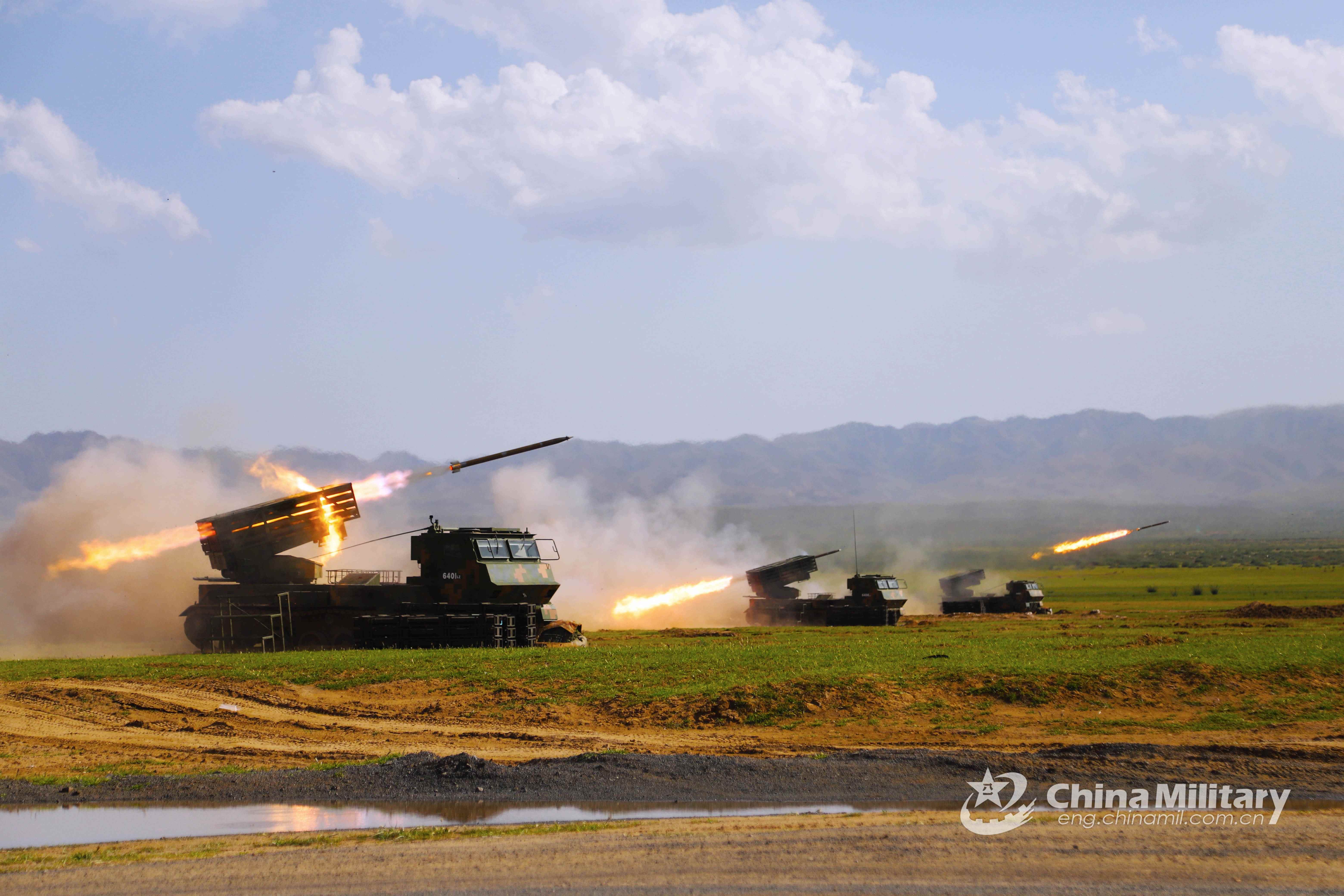 Three tracked rocket launcher systems attached to a brigade under the PLA 82nd Group Army fire at mock targets during a force-on-force live-fire exercise held in the Gobi desert on September 3, 2021. (eng.chinamil.com.cn/Photo by Wang Jianting)