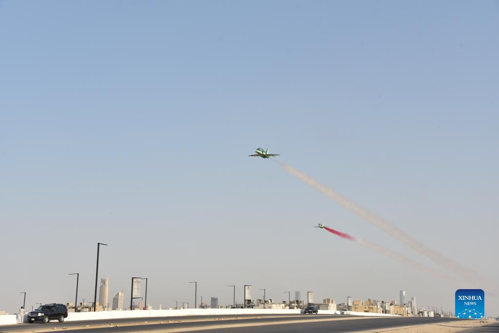 Photo taken on Sept. 22, 2021 shows the Saudi Hawks super low flight aerobatics at the Um Ajlan Park in Riyadh, Saudi Arabia. The airshow was held here on Wednesday and Thursday to celebrate the country's National Day. (Xinhua/Wang Haizhou)
