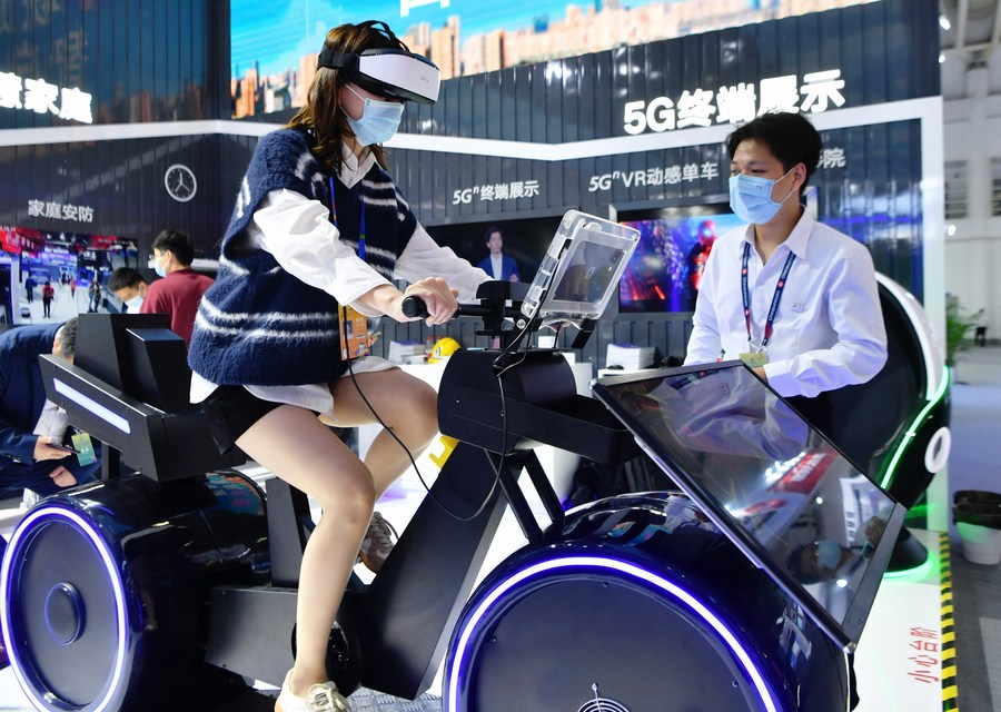 A visitor tries a VR spinning based on 5G technology at the digital achievements exhibition during the fourth Digital China Summit in Fuzhou, southeast China's Fujian Province, April 25, 2021. (Xinhua/Wei Peiquan)