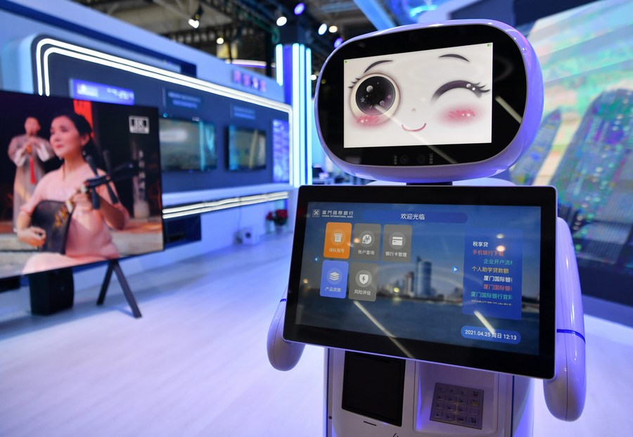 A robot belonging to Xiamen International Bank is seen at the digital achievements exhibition during the fourth Digital China Summit in Fuzhou, southeast China's Fujian Province, April 25, 2021. (Xinhua/Wei Peiquan)