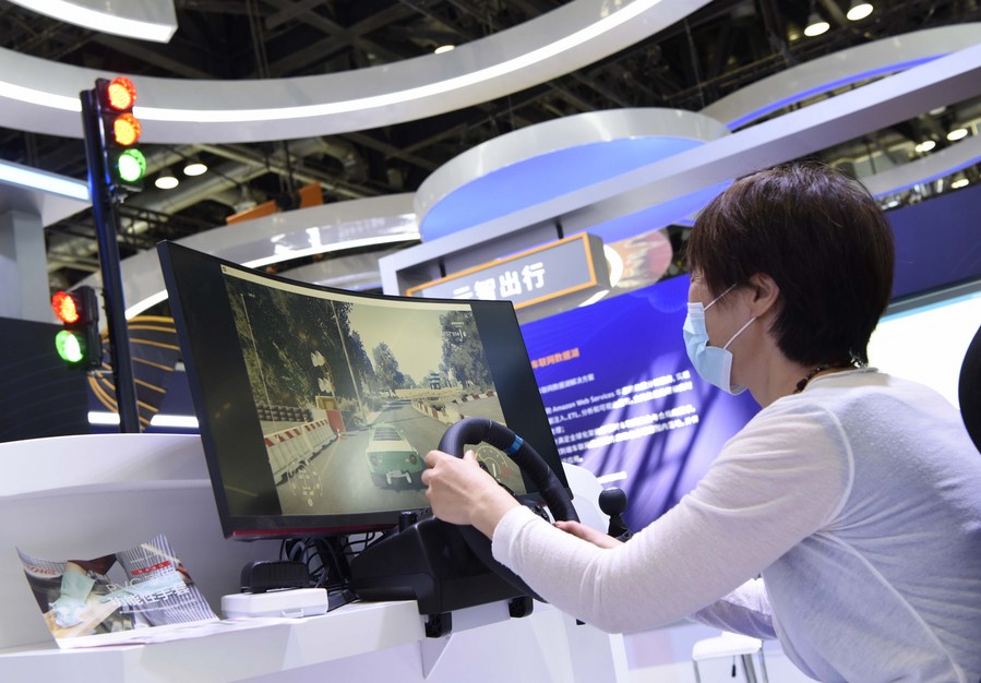 A visitor experiences intelligent driving during the 2021 China International Fair for Trade in Services (CIFTIS) in Beijng, capital of China, on Sept. 7, 2021. (Xinhua/Wu Wei)