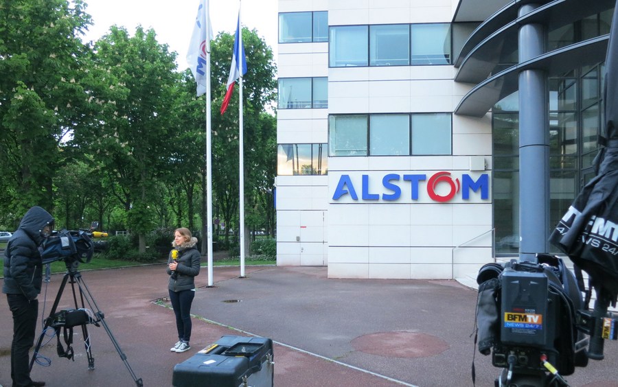 File photo shows journalists reporting at the headquarters of Alstom in Levallois-Perret, outside Paris, France, on April 27, 2014. (Xinhua/Li Genxing)