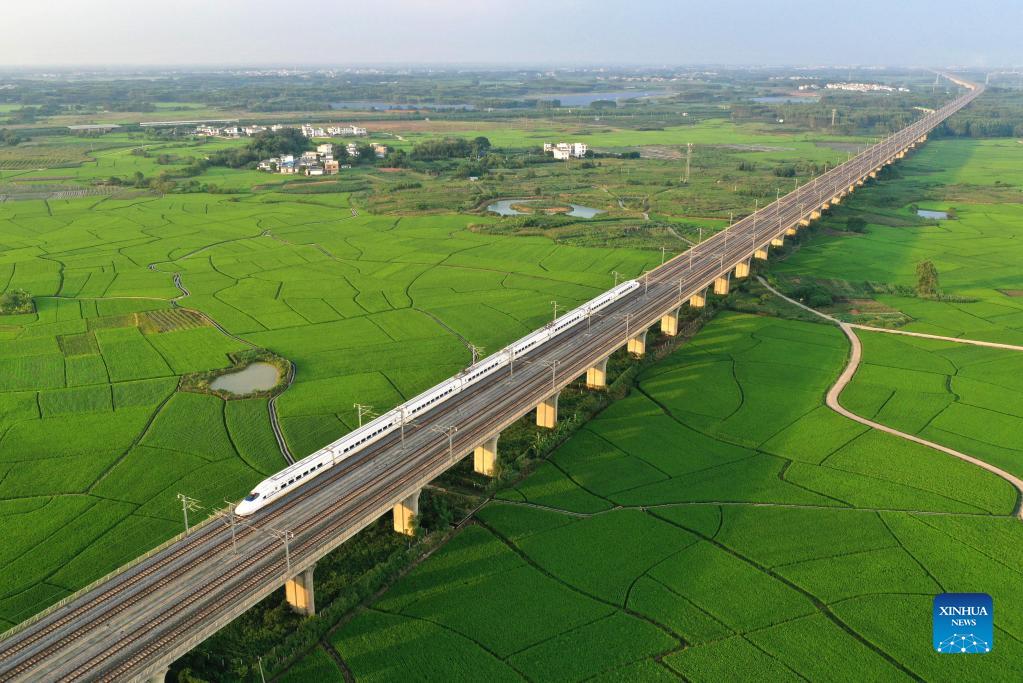 Aerial photo taken on Sept. 19, 2021 shows a high-speed train running over rice fields in Gula Townhip of Binyang County, south China's Guangxi Zhuang Autonomous Region. Thursday marks the Chinese farmers' harvest festival, which is celebrated on the Autumn Equinox every year. (Xinhua/Huang Xiaobang)
