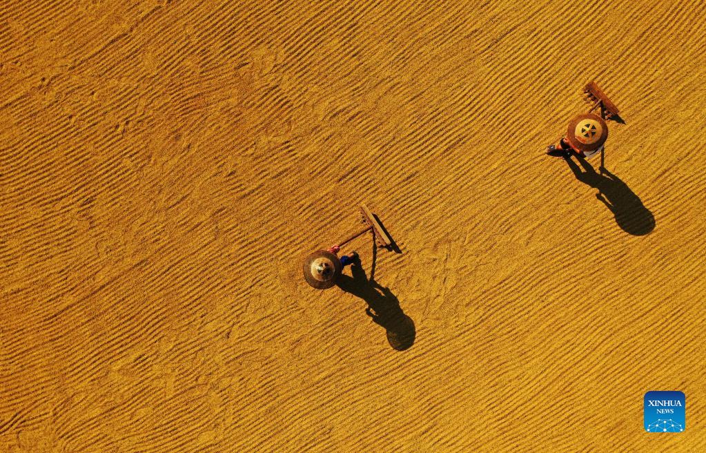 Aerial photo taken on Sept. 23, 2021 shows farmers drying grains in Guanling Township of Hengyang City, central China's Hunan Province. (Xinhua/Zhao Zhongzhi)