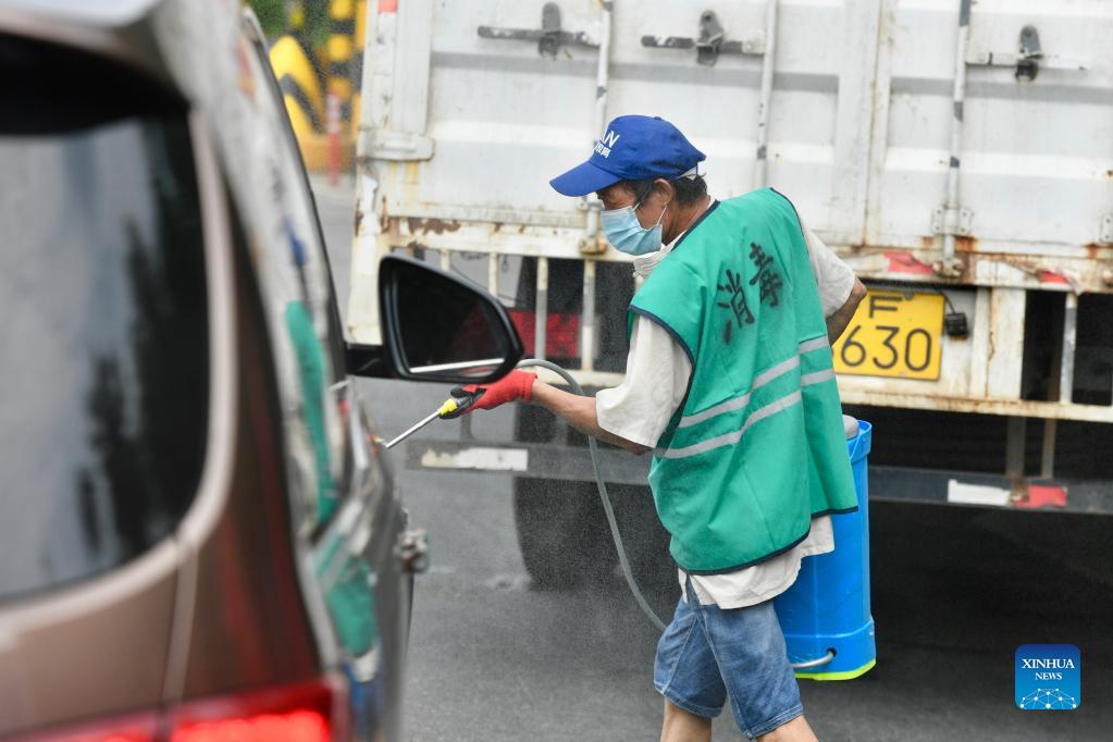 A staff member disinfects a vehicle at an exit of an expressway according to a protocol to curb COVID-19 in Tongan District of Xiamen City, southeast China's Fujian Province, Sept. 23, 2021. Medical workers, public servants, police officers, and volunteers all over Xiamen are mobilized to help Tongan with its COVID-19 prevention and control efforts. Experts under the State Council inter-agency task force for COVID-19 response have arrived at high and medium COVID-19 risk areas in Tongan on Sept. 20 to offer their guidance. (Xinhua/Jiang Kehong)