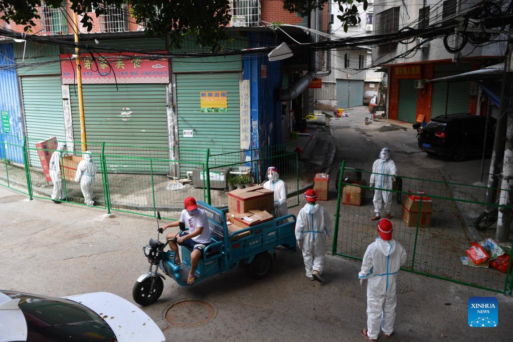 Staff members for COVID-19 response deliver food for residents under quarantine at the Xihu community in Tongan District of Xiamen City, southeast China's Fujian Province, Sept. 23, 2021. Medical workers, public servants, police officers, and volunteers all over Xiamen are mobilized to help Tongan with its COVID-19 prevention and control efforts. Experts under the State Council inter-agency task force for COVID-19 response have arrived at high and medium COVID-19 risk areas in Tongan on Sept. 20 to offer their guidance. (Xinhua/Jiang Kehong)