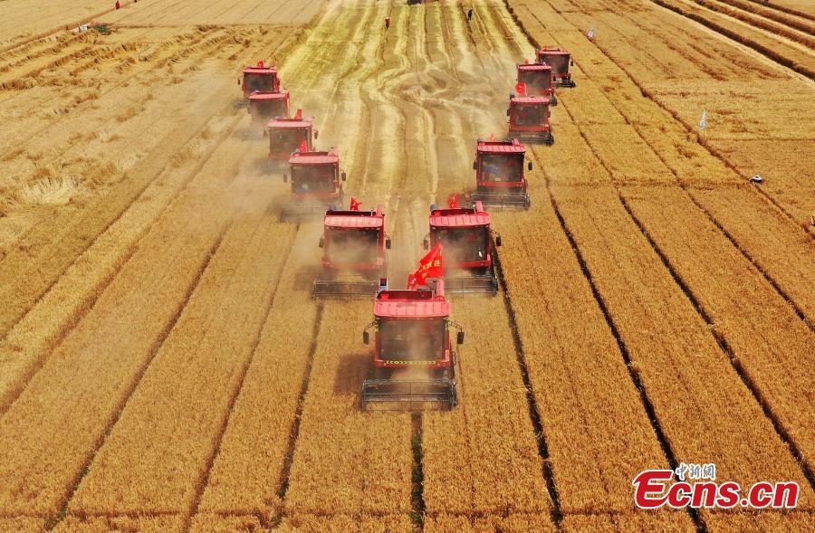 Undated photo shows a harvester team runs along the field. (China News Service/Zhai Yujia)
