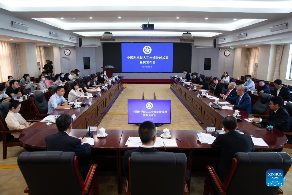 Photo taken on Sept. 23, 2021 shows a scene of the press conference. Chinese scientists have developed an artificial method of synthesizing starch from carbon dioxide, the first of its kind globally. The study, conducted by the Tianjin Institute of Industrial Biotechnology under the Chinese Academy of Sciences, was published in the journal Science on Friday. (Xinhua/Jin Liwang)