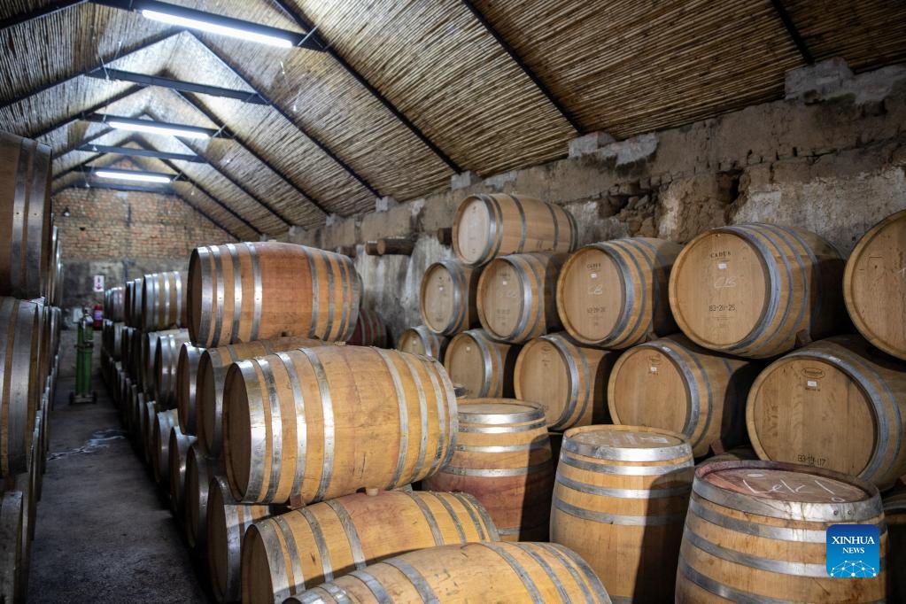 Photo taken on Sept. 21, 2021 shows wine barrels in a wine cellar at Vondeling Wines in Paarl, Cape Winelands, South Africa, on Sept. 21, 2021. With traditional markets in Europe, the South African wine industry is now seeking to export more of its products to a developing market -- China, which has already become a focus market of South Africa. (Xinhua/Lyu Tianran)
