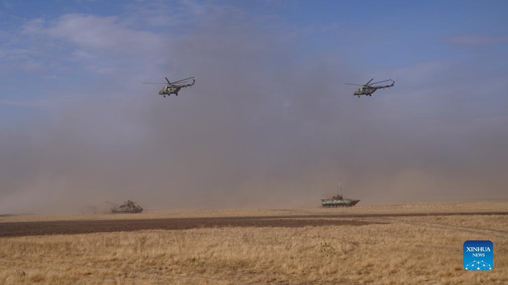 Photo taken on Sept. 23, 2021 shows the live-fire drill "Peace Mission 2021" at the Donguz training range in Orenburg, Russia. Troops participating in the "Peace Mission 2021," a counter-terrorism military exercise for Shanghai Cooperation Organization (SCO) member states, conducted a live ammunition drill at the Donguz training range in Orenburg, Russia on Thursday. (Xinhua/Mei Shixiong)