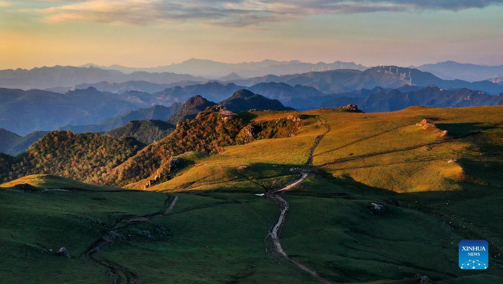 Aerial photo taken on Sept. 23, 2021 shows a view of an alpine meadow in Liuke Township, Lingqiu County, Datong City of north China's Shanxi Province. (Photo by Li Tao/Xinhua)