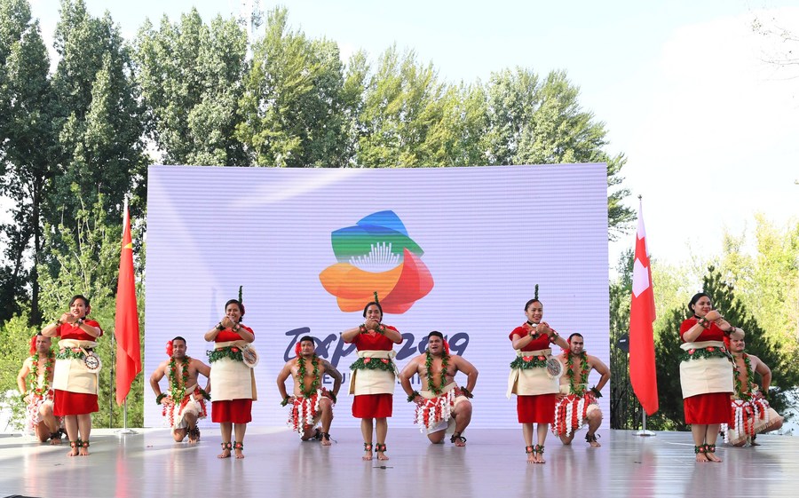 Artists perform during the "Tonga Day" event of the Beijing International Horticultural Exhibition in Beijing, capital of China, Sept. 28, 2019. (Xinhua/Ren Chao)