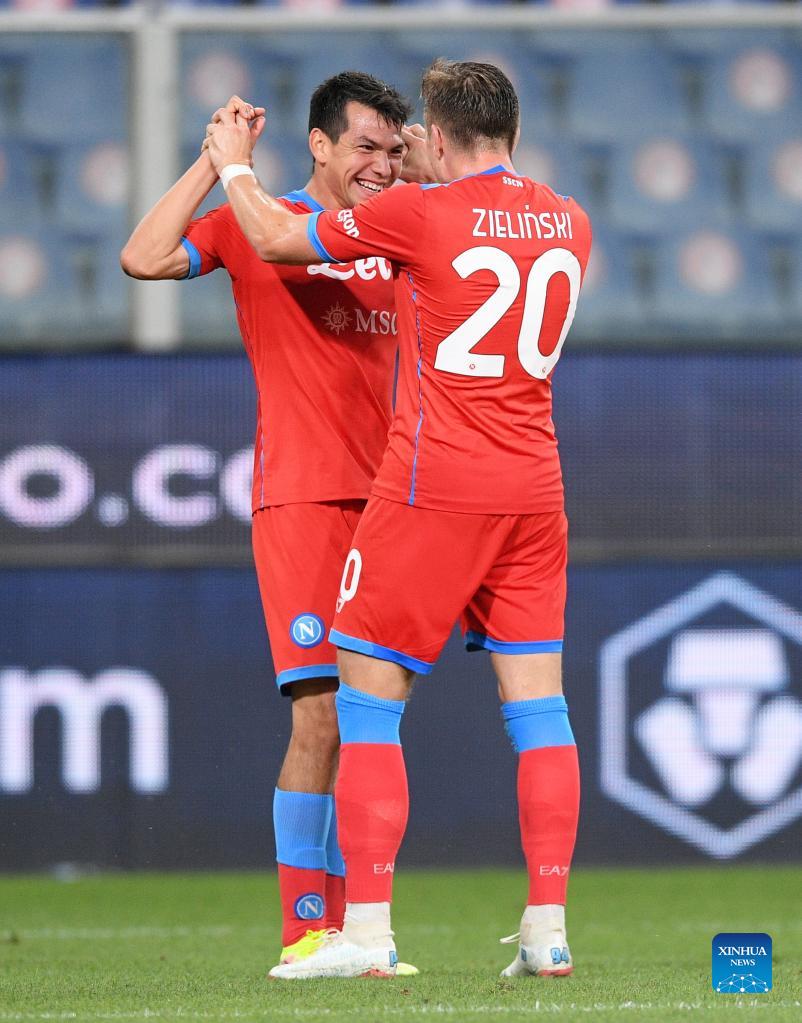 Napoli's Piotr Zielinski (R) celebrates his goal with his teammate Hirving Lozano during a Serie A football match between Napoli and Sampdoria in Genova, Italy on Sept. 23, 2021. (Str/Xinhua)