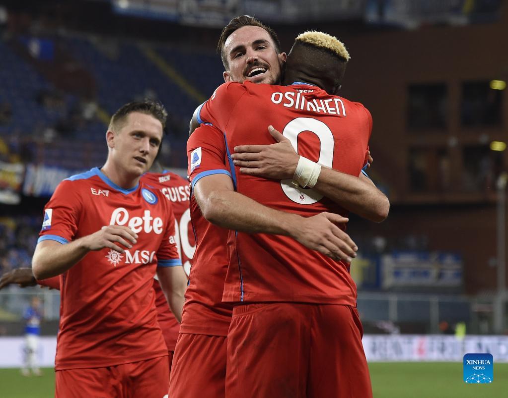 Napoli's Victor Osimhen (front) celebrates his second goal with his teammates during a Serie A football match between Napoli and Sampdoria in Genova, Italy on Sept. 23, 2021. (Str/Xinhua)