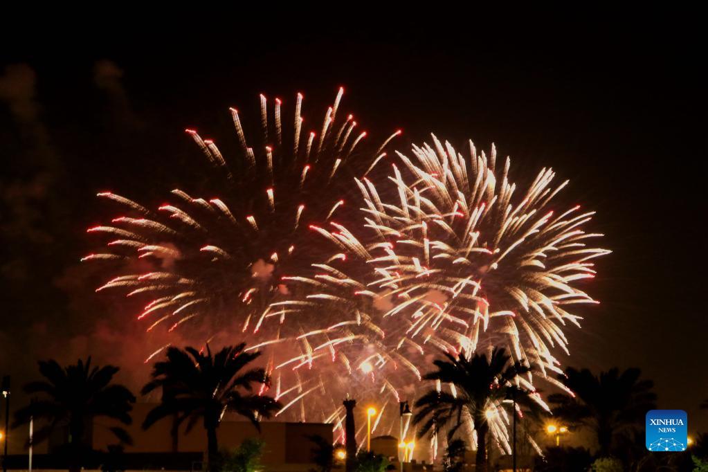 Photo taken on Sept. 23, 2021 shows the national day firework in the sky nearby the Al Diriyah in Riyadh, Saudi Arabia. (Xinhua/Wang Haizhou)