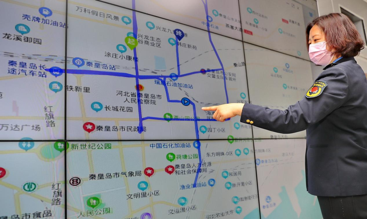 A smart dump truck management platform is employed by the urban management department of Haigang District, Qinhuangdao, north China's Hebei province in April 2020. The platform, powered by the Beidou Navigation Satellite System, is able to monitor over 500 dump trucks of some 40 relevant enterprises in the district 24 hours a day. (Photo by Cao Jianxiong/People's Daily Online)