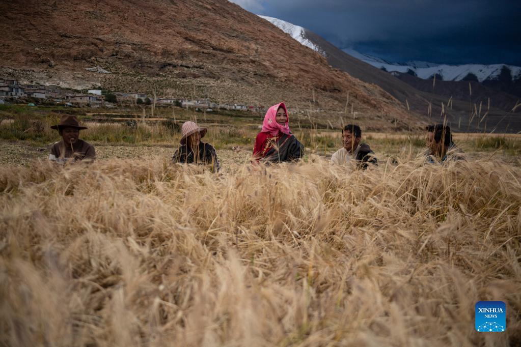 Villagers harvest highland barley at Ombu Township, Nyima County, Nagqu City of southwest China's Tibet Autonomous Region, Sept. 23, 2021. In the plateau county of Nyima, the yearly average temperature stays at minus four degrees Celsius and herding is the main walk of life for most of its residents. But there is one exception -- Ombu Township where two major lakes, Tangra Yumco and Tangqung Co, help create a rare climate for farming in the grasslands. It is also a reason behind such a vast field of highland barley, rarely seen in north Tibet. (Xinhua/Sun Ruibo)