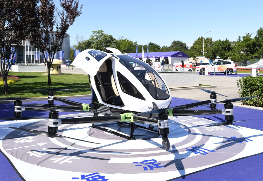 Photo taken on Sept. 17, 2020 shows a passenger-grade autonomous aerial vehicle exhibited during the 2020 Zhongguancun Forum (ZGC Forum) in Beijing, capital of China. (Xinhua/Ren Chao)