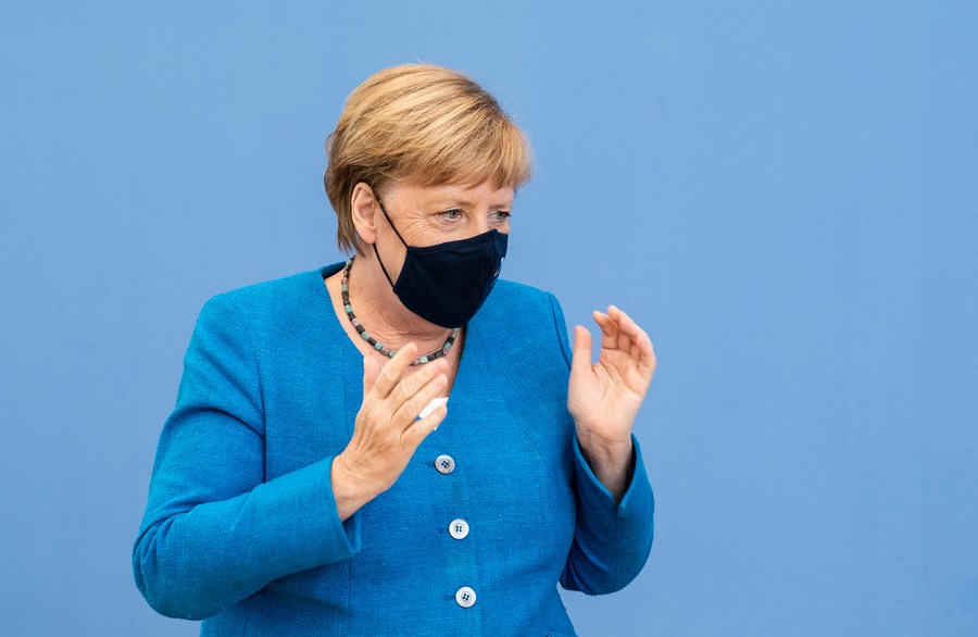 German Chancellor Angela Merkel prepares to leave after a routine press conference in Berlin, capital of Germany, Aug. 28, 2020. (Xinhua/Ren Ke)