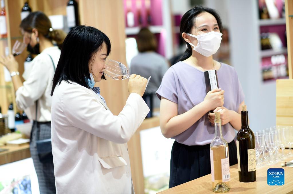 Visitors taste wine at the first China (Ningxia) International Wine Culture and Tourism Expo in Yinchuan, northwest China's Ningxia Hui Autonomous Region, Sept. 25, 2021. The first China (Ningxia) International Wine Culture and Tourism Expo is held from Sept. 25 to 27. (Xinhua/Wang Peng)