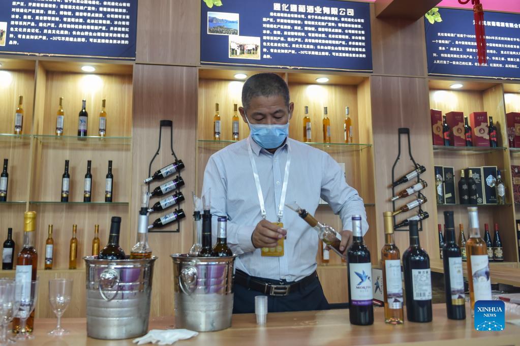 An exhibitor prepares wine at the first China (Ningxia) International Wine Culture and Tourism Expo in Yinchuan, northwest China's Ningxia Hui Autonomous Region, Sept. 25, 2021. The first China (Ningxia) International Wine Culture and Tourism Expo is held from Sept. 25 to 27. (Xinhua/Tang Rufeng)