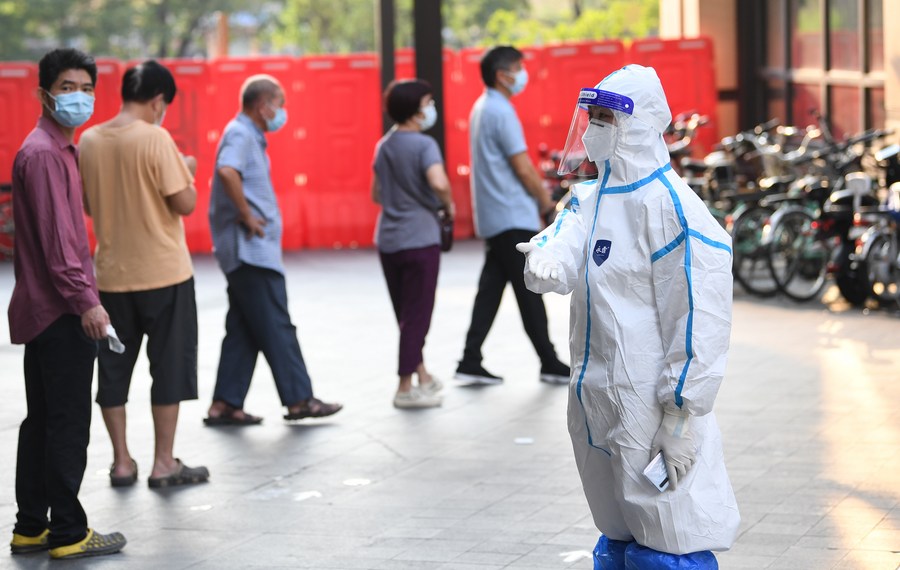 A volunteer guides residents at a COVID-19 nucleic acid testing site in Liwan District of Guangzhou, south China's Guangdong Province, June 8, 2021. (Xinhua/Deng Hua)