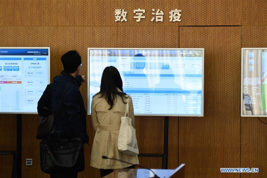 People visit the City Brain Operation Command Center in Hangzhou, east China's Zhejiang Province, April 13, 2020. (Xinhua/Huang Zongzhi)