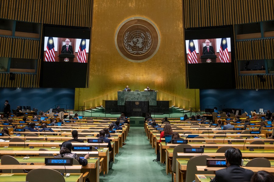 Malaysian Prime Minister Ismail Sabri Yaakob (on the screens) addresses the general debate of the 76th session of the United Nations General Assembly (UNGA) via video at the UN headquarters in New York, Sept. 25, 2021. (Cia Pak/UN Photo/Handout via Xinhua)