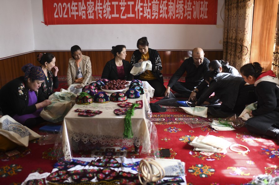 Kader Rahman (3rd R) teaches as local embroiderers learn embroidery techniques in Yizhou District of Hami, northwest China's Xinjiang Uygur Autonomous Region, March 22, 2021. (Xinhua/Wang Fei)