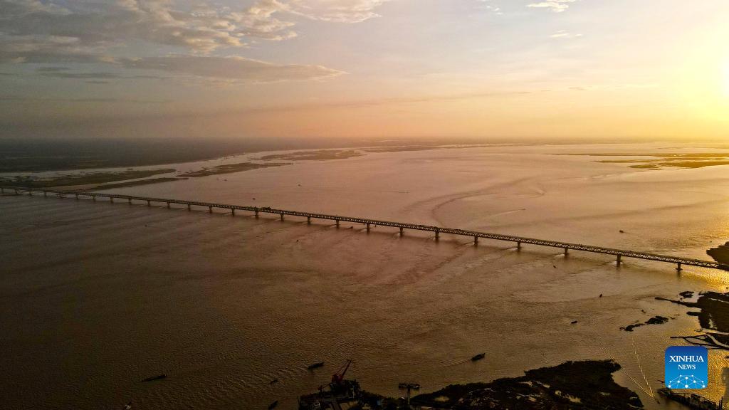 Aerial photo taken on Aug. 21, 2021 shows a view of Padma Multipurpose Bridge Project under construction in Munshiganj on the outskirts of Dhaka, Bangladesh. For Bangladeshis, a dream is coming true. The history of crossing the mighty Padma river between dozens of districts in southern Bangladesh and the capital of Dhaka only by ferries or boats is all set to end. The mega multipurpose road-rail bridge dubbed the "Dream Padma Bridge" of Bangladesh is nearing completion after workers overcame tons of hurdles, including challenges brought by the COVID-19 pandemic. The huge infrastructure, with the main bridge spanning 6.15 km in length, is undertaken by China Railway Major Bridge Engineering Group Co, Ltd (MBEC). It is the largest and most challenging infrastructure project in Bangladesh's history. (Xinhua)