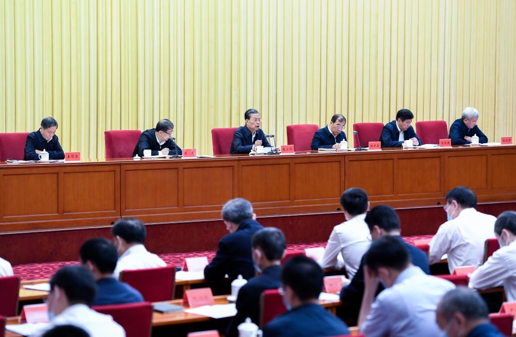Zhao Leji, a member of the Standing Committee of the Political Bureau of the Communist Party of China (CPC) Central Committee and head of the central leading group on disciplinary inspection, makes remarks during a conference ahead of the eighth round of disciplinary inspection by the 19th CPC Central Committee, in Beijing, capital of China, Sept. 26, 2021. (Xinhua/Zhang Ling)