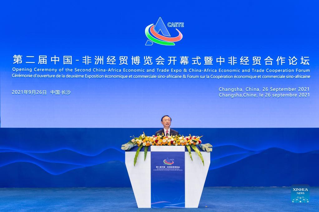 Yang Jiechi, a member of the Political Bureau of the Communist Party of China (CPC) Central Committee and director of the Office of the Foreign Affairs Commission of the CPC Central Committee, addresses the opening ceremony of the second China-Africa Economic and Trade Expo and China-Africa Economic and Trade Cooperation Forum, in Changsha, capital of central China's Hunan Province, Sept. 26, 2021. (Xinhua/Chen Sihan)